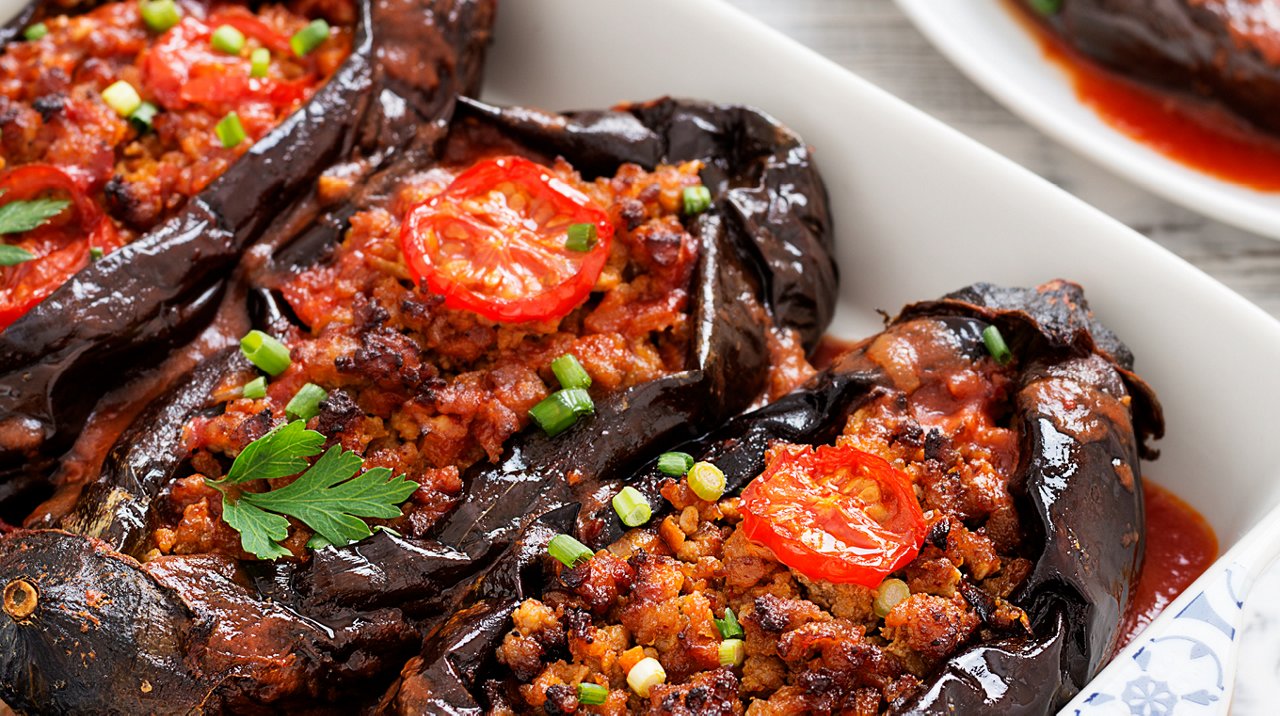 - Verhit de olie in een kleine pan en bak het gehakt rul en de uien en de knoflook zachtjes tot ze lichtbruin zijn. Voeg de aubergine toe en bak nog eens 5 minuten.